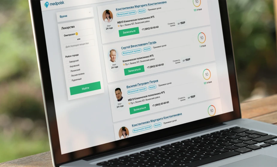 Сервис с поиском врачей и клиник, фильтрацией по специализациям и интеграцией с медицинскими платформами